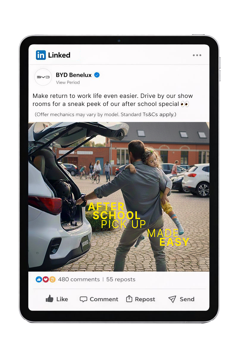 I designed it as a cross-platform system for social feed, stories, short videos, gifs, and OOH. The work reflects the Benelux region’s community-driven, sustainable way of life. By moving beyond dated promotional tropes, the campaign positions BYD as a reliable, accessible partner in shared daily moments. Offering clarity and comfort at a time of return to routine.